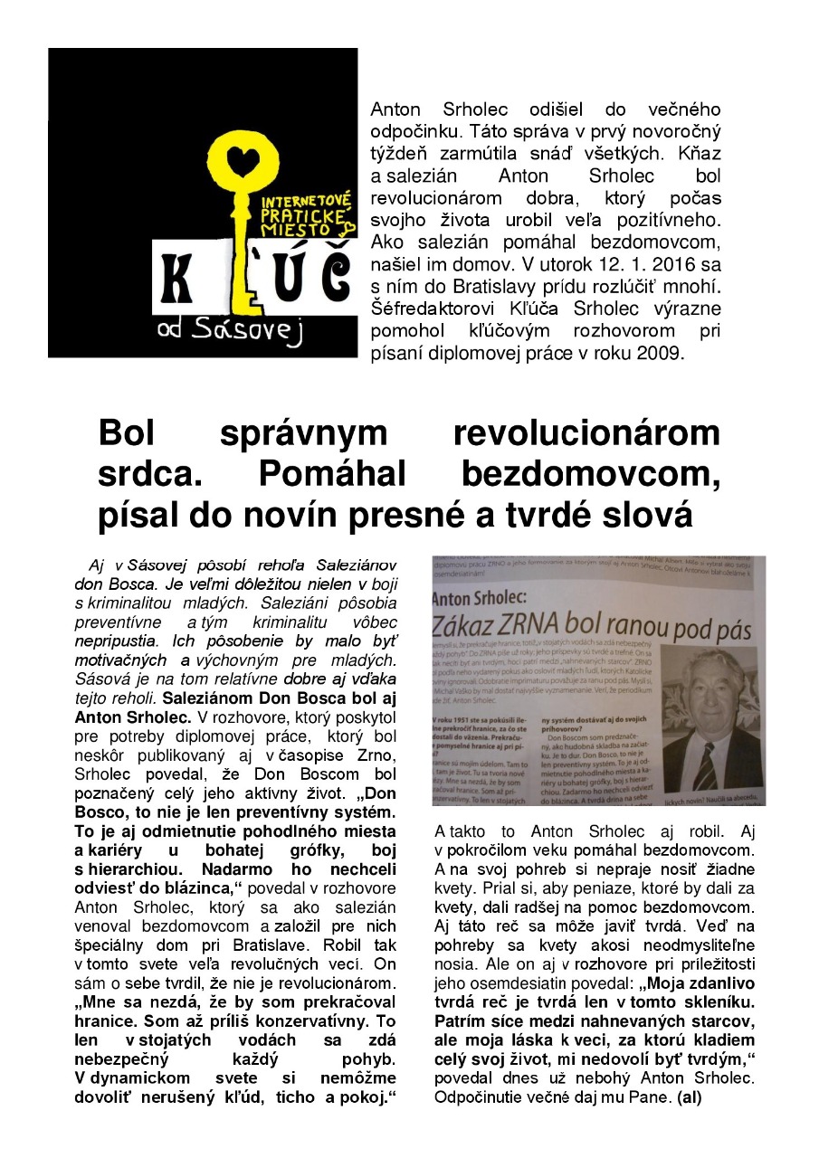 Zomrel velikán Slovenska Don Anton Srholec. Velikán služby, velikán obetavosti. Tento kňaz mohol ísť v šesťdesiatke na dôchodok, no on nešiel a založil dom pre bezdomovcov. 12. 1. 2016 som sa zúčastnil na jeho pohrebe v bratislavskom kostole Blumentál. Tak ako stovky ľudí. Bolo pre nás veľkou milosťou byť pár metrov od pozostatkov tohto svätca. Keď som v roku 2009 finišoval s diplomovou prácou, práve aj Anton Srholec mi pomohol, keď mi poskytol pekný exkluzívny rozhovor, z ktorého som v diplomovke citoval. Okrem iného v ňom povedal aj to, že vôbec nebol revolucionárom, bol konzervatívcom, ale v stojatých vodách sa zdá nebezpečných každý pohyb. Jeho pohyby boli pohybmi lásky. Veď namiesto užívania si dôchodku išiel opäť slúžiť. A práca s bezdomovcami je veľmi zložitá. No on sa jej nebál. A týmto domácim utečencom, týmto imigrantom zo svojich domovov, ponúkol svoje veľké srdce. V dome pre bezdomovcov, ktorý založil, býva okolo 20 bezdomovcov. Je ich ďaleko viac. Ale my všetci môžeme urobiť niečo pre to, aby sme im pomohli. Kamarát napríklad prijal na svoj ranč bývať už množstvo bezdomovcov. Ľudí hodených cez palubu, nad ktorými ostatní len hodili rukou. Ale ani my nevieme, či nedajbože zajtra prídeme o svoje domovy. Nie každý predsa o ne prišiel vlastnou vinou. Kňaz a salezián Anton Srholec, ktorý zomrel vo veku 86 rokov, si neprial na pohrebe kvety. Prial si, aby z kvetov, ktoré by ľudia kúpili, radšej pomohli bezdomovcom. Urobme možno aj dnes, milí čitatelia, malý kúsok dobra pre niekoho hodeného cez palubu – či už pre bezdomovca, alebo niekoho osočeného, ponižovaného. Aby sme aj Srholcovi do neba ukázali, že z jeho života sme malý kúsoček odkukali. Určite nebude žiarliť, že „kradneme“ jeho zámery služby. Určite bude rád, že sme sa ním trochu inšpirovali a pomáhame bezdomovcom – hoci čo i len kúsok. Skúsme to. Skúsme ukradnúť Srholcove nápady a slúžme. Na službu totiž neexistuje céčko v krúžku, teda copyright, ani žiadny patent. Nápady služby sú jediné povolené kradnúť. R.I.P. Don António.